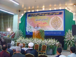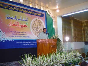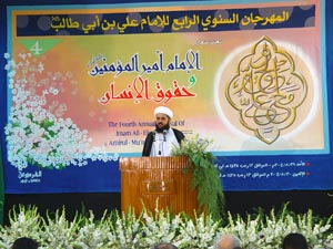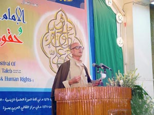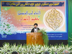 وسط حضور مبارك وغفير من المؤمنين والمؤمنات، حرص جمع كبير ولافت من العلماء والمثقفين والاعلاميين على احياء يوم من أيام الله العظيمة يوم المولد المبارك والميمون للامام أمير المؤمنين علي (عليه السلام)، وذلك في ليلة الثالث عشر من شهر رجب الأصب لسنة 1425 هـ في الحوزة العلمية الزينبية في ضواحي العاصمة السورية دمشق بالقرب من الضريح الطاهر للسيدة زينب (عليها السلام) وذلك من خلال فعاليات اليوم الأول- الأحد من (مهرجان الامام علي بن أبي طالب (عليه السلام) وحقوق الانسان ) السنوي الرابع، والذي ينظمه مركز الفردوس للثقافة والاعلام، و يستمر على مدى يومين. استهل الحفل المبارك بتلاوة آيات مباركات من الذكر الحكيم رتلها على أسماع الحضور الكرام سماحة الأستاذ المقرئ الشيخ حسن المحمدي بعد أن قدم عريف الحفل الأستاذ زكي النوري كلمات وأبيات رائعة تتحدث عن هذه المناسبة العظيمة فيما أنشدت بعدها فرقة الامام الصادق (عليه السلام)الأناشيد الجميلة من وحي هذه الذكرى العطرة والغنية بأسمى المعاني الانسانية النبيلة والرائعة. أولى الكلمات كانت للاستاذ حسين السيد ألقاها باسم مركز الفردوس للثقافة والاعلام واللجنة المنظمة، تحدث فيها عن أهمية مثل هذه المهرجانات في ترسيخ قيم الفضيلة والخير والجمال والعدل والبر في عقول وقلوب الناس لتمهيد السبل لبناء الانسان المؤمن والمجتمع الصالح والأمة المؤهلة وبكل جدارة لرفع راية العلم والحضارة والعدالة الانسانية وحقوق الانسان التي جاء بها الاسلام لخير الناس كافة؛ حيث اعتبر هذه المهرجانات وماتحمله من قيم ثقافية أفضل الوسائل الحضارية في تبليغ وايصال كلمة الاسلام للعالم كله وبالصورة التي تكفل حسن الانصات والاستماع وبكل انفتاح علمي وموضوعي، يجعل ذلك الآخر في مقام لا مفر له من الاستجابة لهذا النداء الحضاري الذي لا يبحث إلا عن الحقيقة الخالية من كل لبس وجهل وتزوير. ثم ألقى سماحة الشيخ محمد رضا حاتم كلمة أكد فيها على أن الامام أمير المؤمنين علي (عليه السلام) كان وسيبقى النموذج الحضاري المتميز من بين سائر أصحاب النبي (صلى الله عليه وآله وسلم) وتلامذة مدرسته الفكرية ويرجع هذا إلى ما توافر له (ع)من عوامل شاركت متكاملة في شخصيته الفكرية. وأضاف الشيخ حاتم : إن كل هذه المؤهلات التي ميزت الامام علي (عليه السلام) عن الآخرين تعود الى أن الله تعالى أراد بذلك اعداده لحمل الرسالة وتحمل مسؤولياتها بعد النبي (صلى الله عليه وآله وسلم). وقال سماحة الشيخ محمد رضا حاتم إن هذا لا يتأتى إلا ممن وعى مسؤولية القائد الرسالي وعيا حيا ووضع أمامه ونصب عينيه تحقيق أهداف الرسالة الاسلامية السامية وقال أيضاً. ان الامام علي (عليه السلام) يفوق في حجمه حد التوهمات ويعلو الحقائق ولم يكن كل ذلك بالاسباب المعجزية بل بالأسباب الطبيعية. وفي ختام كلمته، أكد سماحة الشيخ حاتم على أن الامام علي (عليه السلام) لم يكن للمسلمين وحدهم كما لم يكن للشيعة وحدهم بل كان وسيبقى للانسانية جمعاء. أعقب ذلك كلمة للأستاذ أنطوان بارا تطرق فيها إلى نبذة تاريخية إلى نشوء وتطور مسألة حقوق الانسان على مدى العصور والأزمان السالفة ودور الفكر الديني والفلسفي والسياسي في كل ذلك. وأضاف فضيلة الأستاذ أنطوان بارا: ان لفرط الاهمال الواضح لقيم الاسلام الانسانية وتراث الشرق الفكري القديم والحديث من قبل الغرب إضافة إلى عوامل أخرى عديدة أدى إلى بروز العديد من المؤرخين والباحثين الذين يرون أن مسألة حقوق الانسان غربية المنشأ. وقد أكد الأستاذ أنطوان بارا على أن الامام علي(ع) عرف العدالة والحق فنصرهما لجوهرهما وأن الحكم التي أطلقها كانت تهدف إلى تربية الناس على الفضائل والقيم الخيرة والانسانية النبيلة فكان للناس كل الناس. وكان للشعر حضوره من خلال ما أنشده الأستاذ عريف الحفل ما بين فقرات الحفل، وأيضاً من خلال القصيدة الطويلة الرائعة للأستاذ الشاعر أحمد عيد، والتي استهلها بالبيت الشعري: علاك وما في الكون مثلك أن يرى*** علياً أمير المؤمني